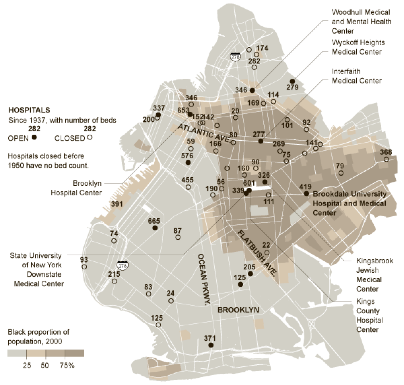 Nearly half of Brooklyn’s residents, 1.2 million people, are Medicaid beneficiaries. The majority of Medicaid beneficiaries are located in predominantly black and brown communities such as Brownsville, Crown Heights, and East New York. Negative health outcomes are not just based on individual status; they are also influenced by the level of disadvantage in the surrounding neighborhood. Research shows strong associations between residential segregation and poor health outcomes, and between experiences of discrimination, chronic stress, and related long-term health challenges. Segregation, interpersonal discrimination, and structural racism constitute serious assaults on health.9