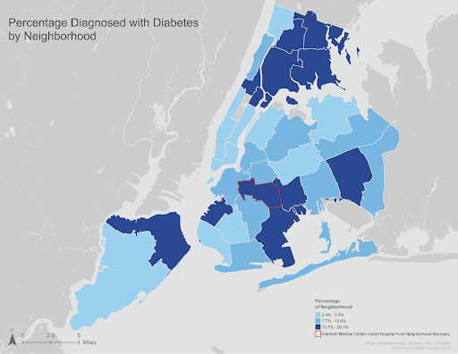 It found that diabetes was one of the most common health concerns for the area. The percentage of Central Brooklyn adults diagnosed with diabetes surpassed NYC and borough averages.