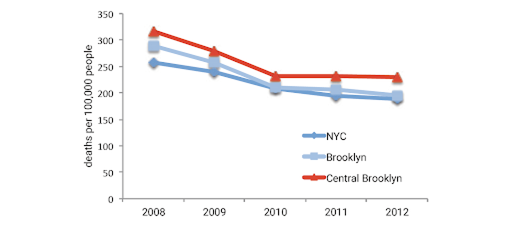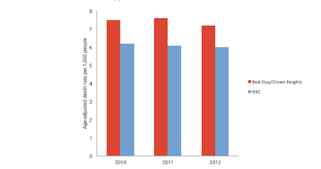The Report observed that concentrated poverty, under- or unemployment, low wages, and historical social disadvantage all combined to create serious health risks. These risks included premature mortality: Central Brooklyn neighborhoods lose more residents at young ages than almost anywhere else in the City. Between 2010 and 2012, the age-adjusted mortality rate in majority African-American Bedford Stuyvesant remained significantly higher than the New York City average and disease-specific mortality rates, eg., from heart disease, showed similar trends.46