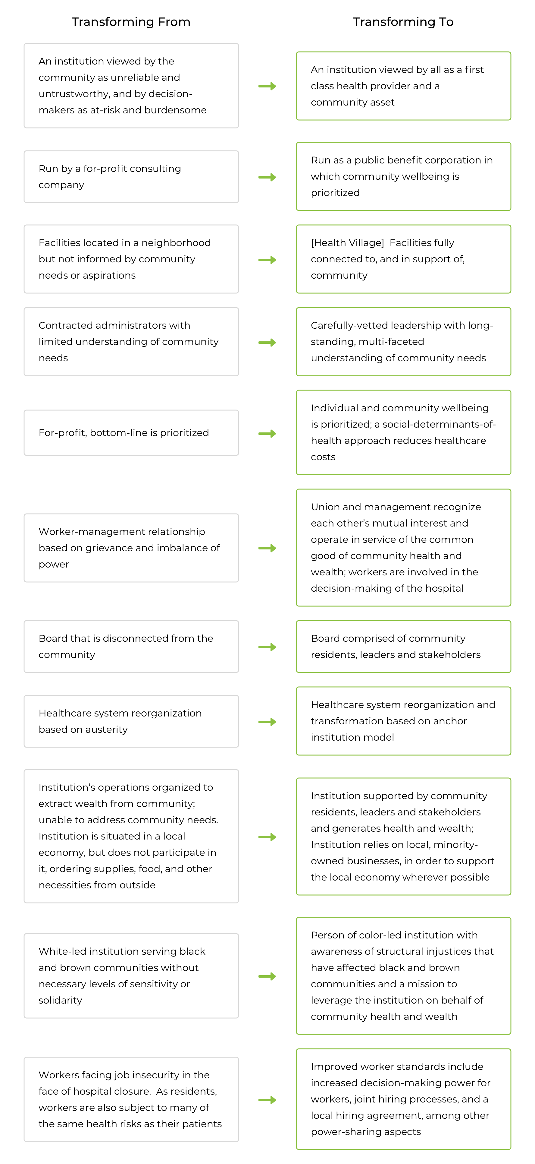 LaRay Brown’s appointment is widely seen as one of the Coalition’s most important victories. It unleashed the potential for a meaningful alignment of the community’s vision for Interfaith with the sorely needed institutional redesign mandated by DSRIP. The table below highlights the changes envisioned by the community.